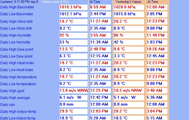 Daily high pressure 1011.1 hPa Daily low pressure 1008.4 hPa Daily low windchill 13.7°C Daily high heat index 19.9°C Daily high gust speed 7.0 m/s W Daily high average speed 3.6 m/s WNW