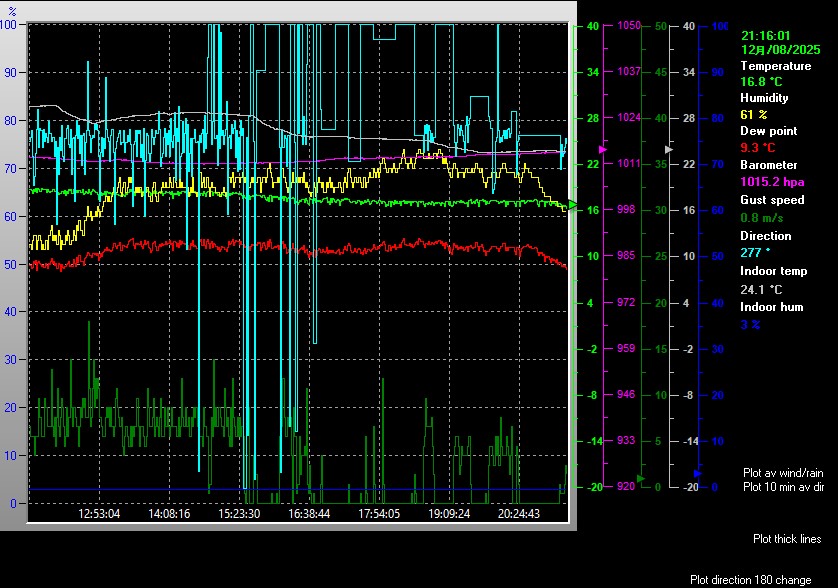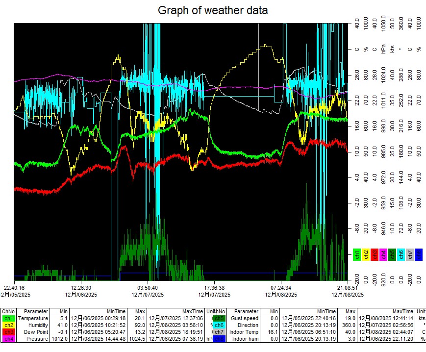 Record high temperature 38.6°C Record low temperature -0.8°C Record high gust 114.3 m/s Record high average 9.7 m/s Record daily rain 98.8 mm Record low windchill -17.8°C Record high barometer 1049.5 hPa Record low barometer 818.8 hPa