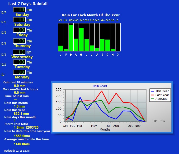 Record daily rain: 98.8 mm at: 23:53 on: 12 Mar 2025