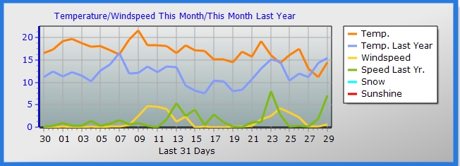 Maximum gust speed = 14.9 m/s from 293(WNW) on day 17 at time 14:32